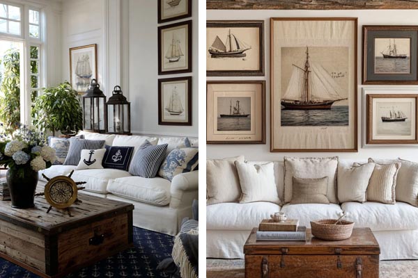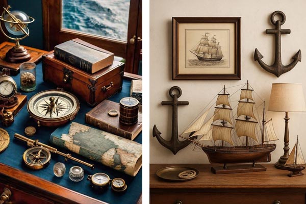 Η καρδιά της nautical διακόσμησης χτυπά στα αντικείμενα που κουβαλούν ιστορία. Τα ναυτικά όργανα όπως οι πυξίδες, τα κιάλια, οι εξάντες, τα τηλεσκόπια, τα σκάφανδρα ή τα πηδάλια πλοίου παραπέμπουν σε εξερεύνηση και προσανατολισμό. Τα διακοσμητικά καραβάκια, -μινιατούρες ιστορικών πλοίων ή παραδοσιακών ψαροκάικων-, θυμίζουν ταξίδια, λιμάνια και ανοιχτές θάλασσες. Τα vintage ξύλινα πινακάκια με θέμα τη θάλασσα και τα πλοία προσθέτουν μια ήσυχη νοσταλγία. Το μυστικό είναι να μην τα τοποθετήσετε όλα μαζί, αλλά να αφήσετε κάθε αντικείμενο να “αναπνέει” και να λέει τη δική του ιστορία.
