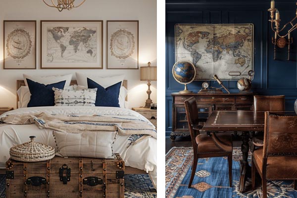 Το ναυτικό ύφος είναι πιο ευέλικτο απ’ όσο φαίνεται και μπορεί να εφαρμοστεί με επιτυχία σε όλους τους χώρους του σπιτιού, είτε στην πόλη, είτε στην εξοχή. Στο γραφείο, οι βιβλιοστάτες με ναυτικά στοιχεία δίνουν χαρακτήρα και μετατρέπουν τον χώρο σε ένα ήρεμο σημείο σκέψης. Στο καθιστικό, πίνακες με θέμα τη θάλασσα λειτουργούν σαν παράθυρα σε μακρινούς ορίζοντες. Στο υπνοδωμάτιο, το nautical στυλ γίνεται πιο ήπιο, με έμφαση στην αίσθηση χαλάρωσης. Στην τραπεζαρία, ένα μπαράκι σε σχήμα υδρόγειου σφαίρας φέρνει στο τραπέζι την ιδέα του ταξιδιού και της φιλοξενίας, χωρίς υπερβολή.