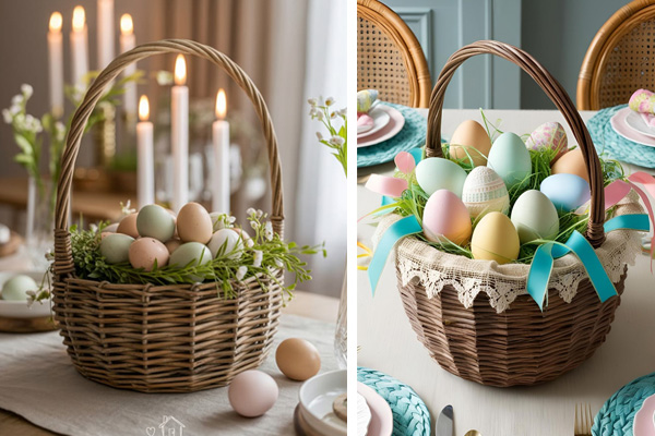 Ένα καλάθι στο κέντρο του τραπεζιού φέρνει μαζί του μια πιο οικεία, χειροποίητη αίσθηση. Τοποθετήστε μέσα μια Πασχαλινή κοτούλα και τα βαμμένα σας αβγά γεμίζοντας τα κενά ανάμεσά τους με πράσινα φυλλώματα και λουλουδάκια. Διαφορετικά, δημιουργήστε μία πιο ρομαντική σύνθεση στρώνοντας στο εσωτερικό του καλαθιού μια δαντελένια πετσετούλα και δένοντας κορδέλες στα χερούλια. Το φυσικό υλικό του καλαθιού δημιουργεί αμέσως ζεστασιά και κάνει το τραπέζι να μοιάζει πιο φιλόξενο, δείχνοντας σε όλους τους καλεσμένους ότι έχει ετοιμαστεί με φροντίδα και αγάπη.