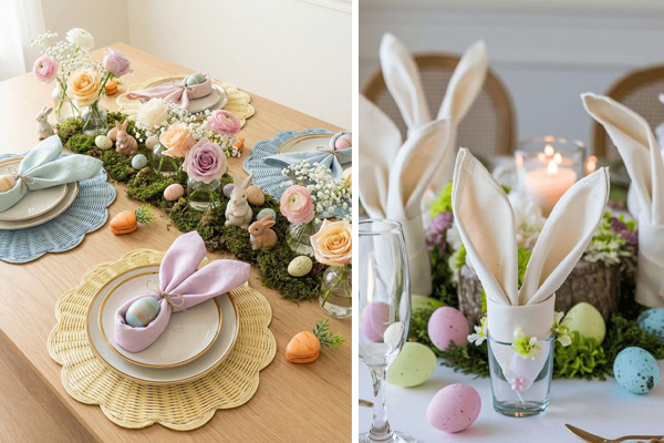 Αν προτιμάτε κάτι πιο διακριτικό, μια όμορφη ανθοσύνθεση στο κέντρο του τραπεζιού είναι πάντα μια κομψή επιλογή. Για να ισορροπήσετε τη σοβαρή εικόνα και να δώσετε μια παιχνιδιάρικη πασχαλινή πινελιά, μπορείτε να προσθέσετε μικρές λεπτομέρειες στα σερβίτσια. Πετσέτες διπλωμένες σε σχήμα αυτιών λαγού, με ένα αβγό στο εσωτερικό τους, τοποθετημένες μέσα στο πιάτο ή ακόμη και μέσα στα ποτήρια, δημιουργούν μια εικόνα που θα εντυπωσιάσει χωρίς να κουράζει. Είναι αυτές οι μικρές διακοσμητικές εκπλήξεις που κάνουν το τραπέζι σας ξεχωριστό.